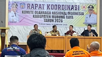 PURUK CAHU, lingkarmerah.my.id – Komite Olahraga Nasional Indonesia (KONI) Kabupaten Murung Raya menggelar Rapat Koordinasi (Rakor) Tahun 2026, Jumat (13/2/2026), di Kantor Dewan Adat Dayak (DAD) Puruk Cahu. Kegiatan Rakor tersebut dipimpin oleh Bupati Murung Raya, Heriyus.