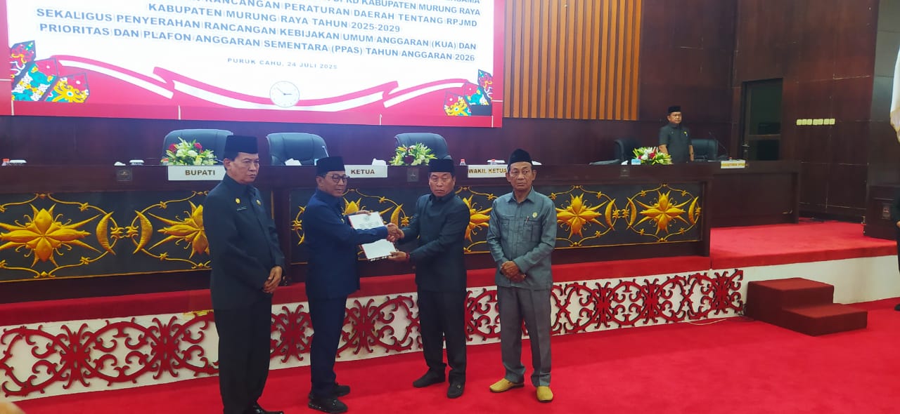 PURUK CAHU, lingkarmerah.my.id – Dewan Perwakilan Rakyat Daerah (DPRD) Kabupaten Murung Raya (Mura) menggelar Rapat Paripurna ke-4 Masa Sidang II Tahun 2025 dalam rangka penandatanganan Keputusan DPRD dan Berita Acara Persetujuan Bersama terhadap Rancangan Peraturan Daerah (Raperda) tentang Rencana Pembangunan Jangka Menengah Daerah (RPJMD) Kabupaten Murung Raya Tahun 2025-2029.