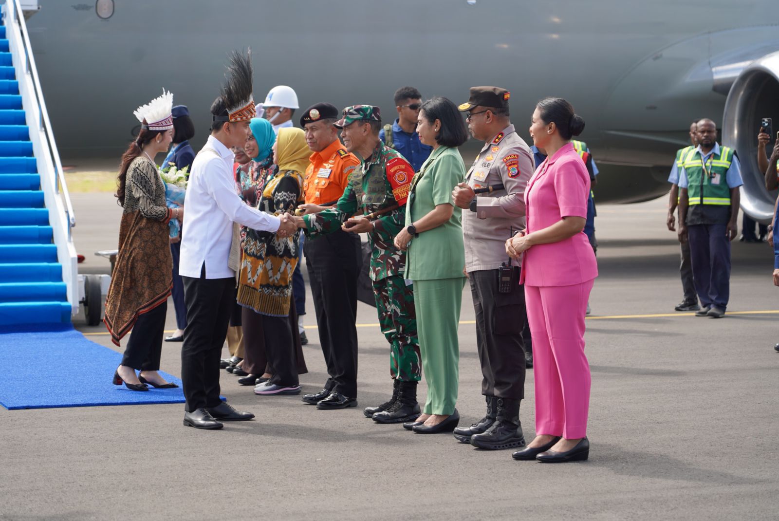 Mengenakan mahkota khas Kasuari, Wapres dan Ibu Selvi kemudian disambut dengan tarian adat Papua yang memukau, “Teras Seni”, sebagai bagian dari penghormatan budaya dan simbol kerja sama pembangunan antara pemerintah pusat dan masyarakat Papua Barat.